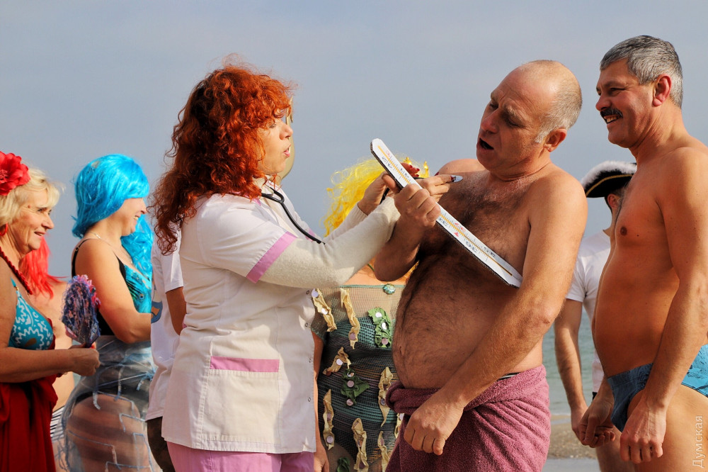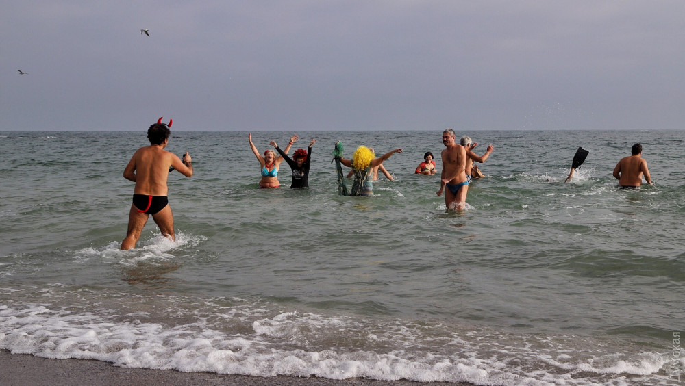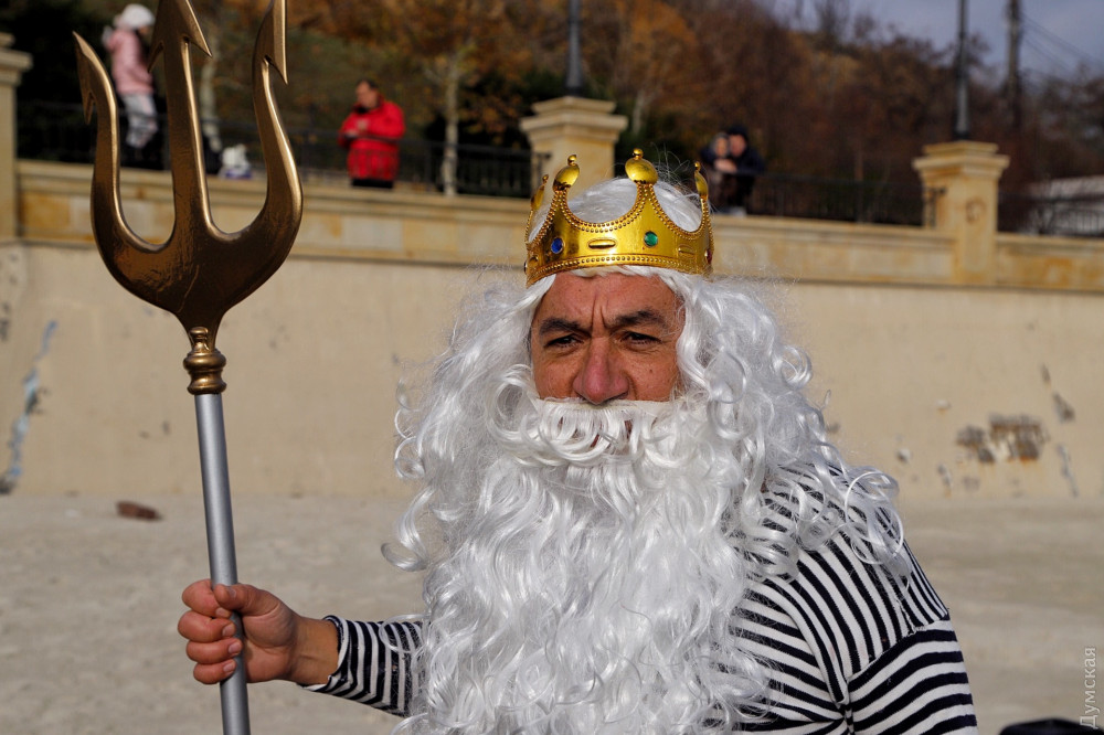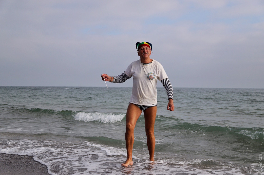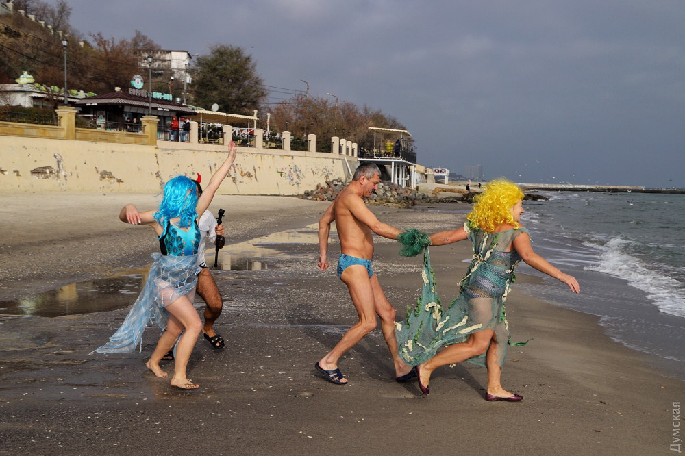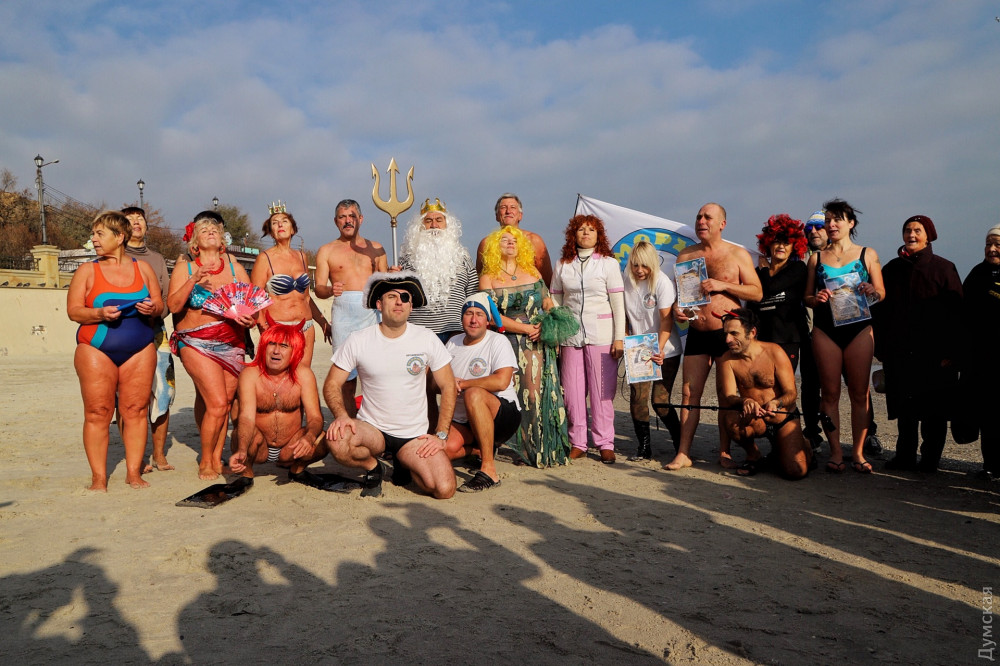 Перед тим як зануритися в студені води Чорного моря, одеські моржі влаштували костюмовану виставу — Нептун зі свитою русалок прийняв до лав моржів-новачків: сімох новачків спочатку скупали в морі, а потім вручили їм грамоти.