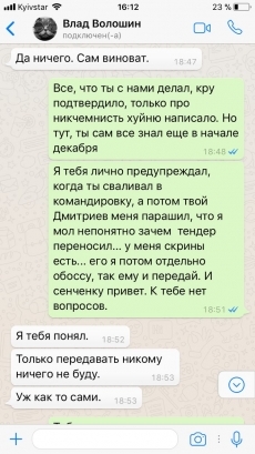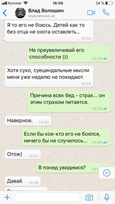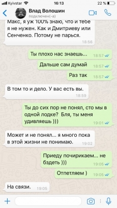 Через декілька годин після самогубства Владислава Волошина, Андрій Лохматов опублікував скріншоти смс-листування загиблого з невідомою людиною (чи кількома людьми), в яких обговорюється ситуація, яка склалася навколо аеропорту.