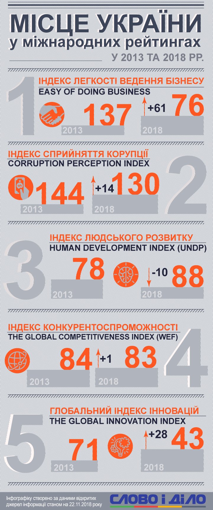 Цікаво спостерігати, як змінився за п’ять років індекс сприйняття корупції (Corruption perception index щорічний). Цей щорічний рейтинг країн світу складає Transparency International за оцінками підприємців та аналітиків. У 2013 році Україна була на 144-му місці. За п’ять років країна піднялася на 14 позицій і зараз перебуває на 130-му місці.