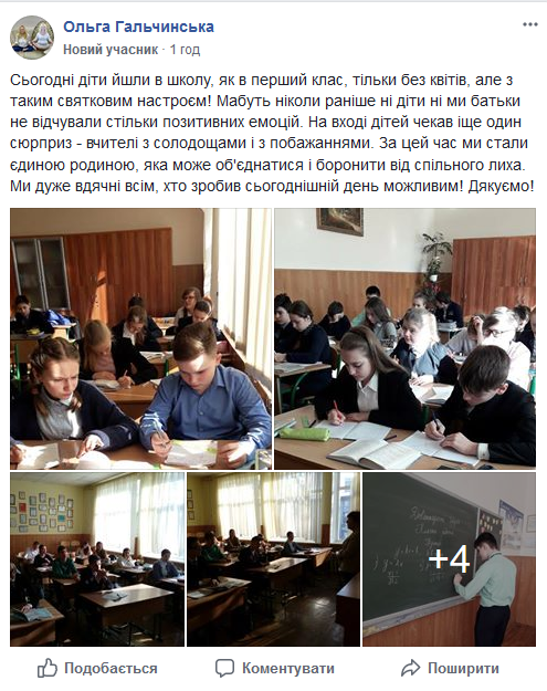 Сьогодні діти йшли в школу, як в перший клас, тільки без квітів, але з таким святковим настроєм! Мабуть ніколи раніше ні діти ні ми батьки не відчували стільки позитивних емоцій. На вході дітей чекав іще один сюрприз – вчителі з солодощами і з побажаннями. За цей час ми стали єдиною родиною, яка може об’єднатися і боронити від спільного лиха. Ми дуже вдячні всім, хто зробив сьогоднішній день можливим! Дякуємо!